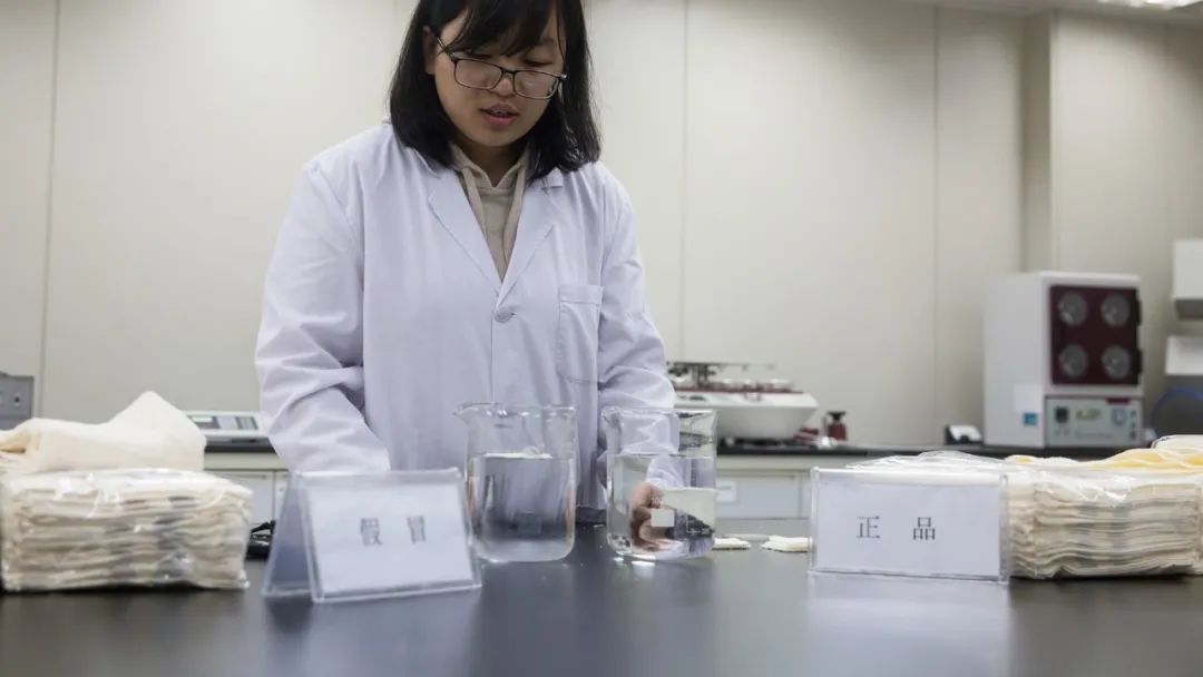 毛巾的吸水性是顯示其內(nèi)在品質(zhì)的重要指標(biāo)。在孚日集團(tuán)技術(shù)中心恒溫恒濕實(shí)驗(yàn)室,技術(shù)人員對涉案假冒毛巾進(jìn)行了吸水性對比測試。正品毛巾試樣在接觸水面瞬間即開始吸水沉降,顯示出遠(yuǎn)遠(yuǎn)優(yōu)于國家標(biāo)準(zhǔn)的吸水性。而假冒毛巾試樣超過90秒仍未開始沉降,品質(zhì)優(yōu)劣高下立判。值得一提的是,GB/T 22799-2019《毛巾產(chǎn)品吸水性測試方法》正是孚日集團(tuán)牽頭指定的國家標(biāo)準(zhǔn)之一。