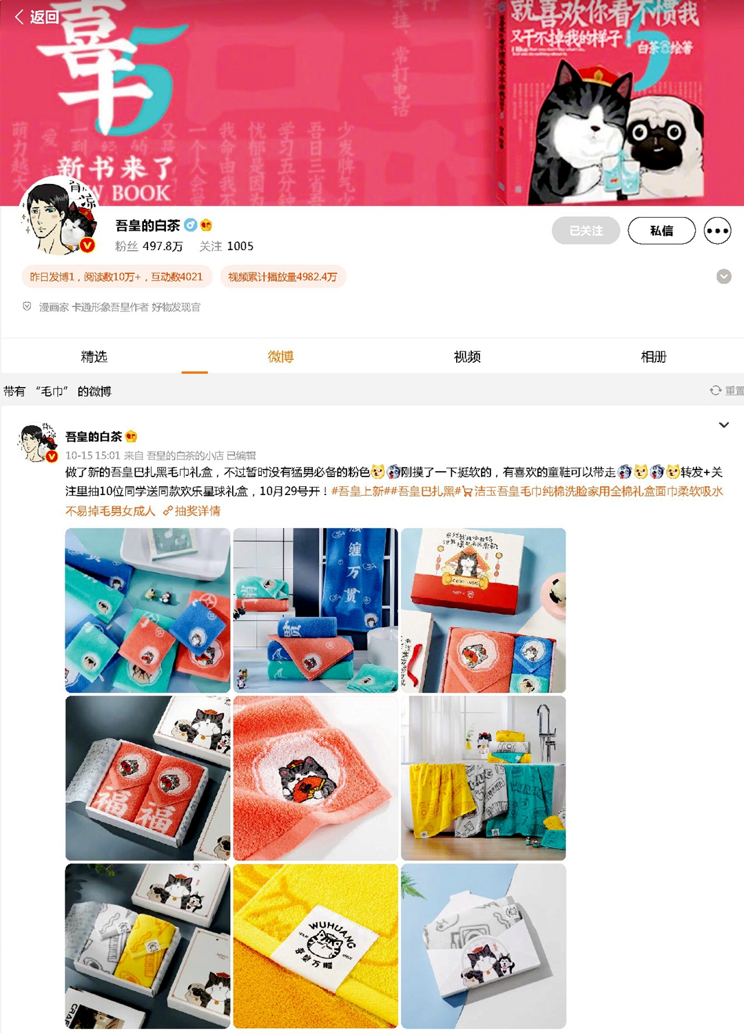 2021年10月15日,漫畫家、卡通形象吾皇作者“吾皇的白茶”發(fā)布微博,稱“做了新的吾皇巴扎黑毛巾禮盒,不過暫時(shí)沒有猛男必備的粉色,剛摸了一下挺軟的,有喜歡的童鞋可以帶走”,配圖赫然正是孚日集團(tuán)攜手“吾皇萬睡”新推出的傲嬌巾品。